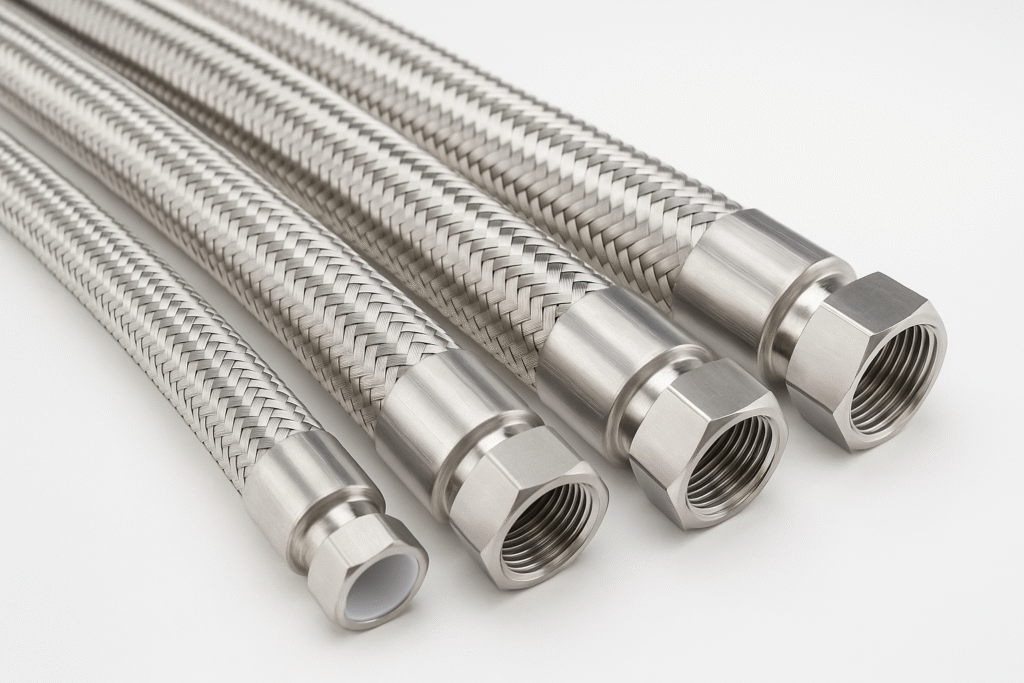 Disponible en modelos trenzados con acero inoxidable para soportar presiones elevadas en líneas hidráulicas y neumáticas.