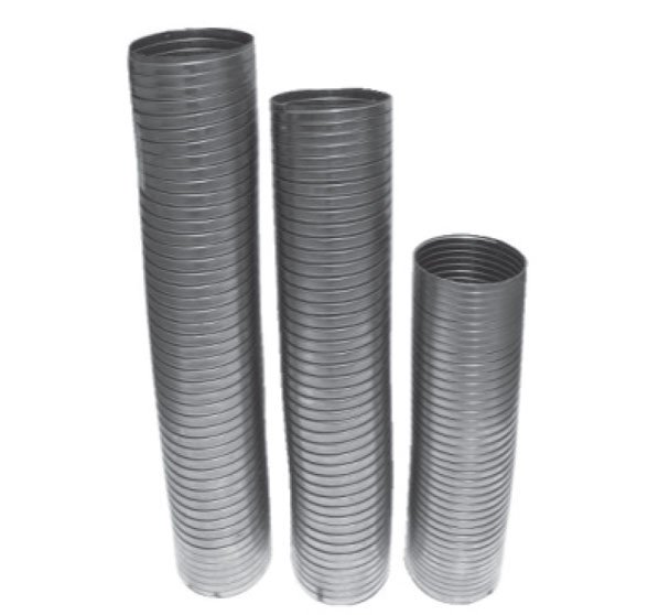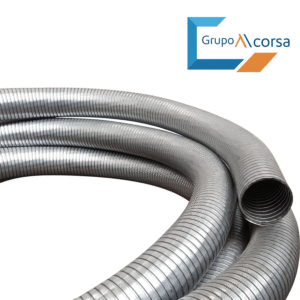 Imagen de tubería metálica flexible de acero galvanizado para escape, medida 4 pulgadas y mayores. Ideal para motores grandes, extractores y sistemas industriales de alta temperatura. Distribuido por Grupo Acorsa en Perú.