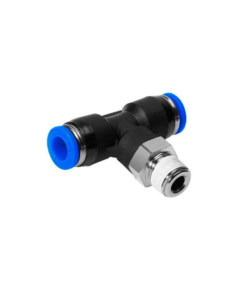 Este es un conector de unión en forma de «T» neumático de tipo push-in. Está diseñado para dividir una línea de flujo en dos direcciones perpendiculares. Al igual que el conector recto, está fabricado con un cuerpo principal de material plástico resistente. Los anillos azules en cada extremo indican las zonas de inserción push-in y están hechos de un material flexible que asegura una conexión hermética y segura al insertar la manguera o tubería.